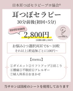 耳つぼMENU2025年09月01日MENU ご予約希望の方は、①②③のメニューを選んでいただき、①のみ初回特別価格2,800円となりま...続きを読む